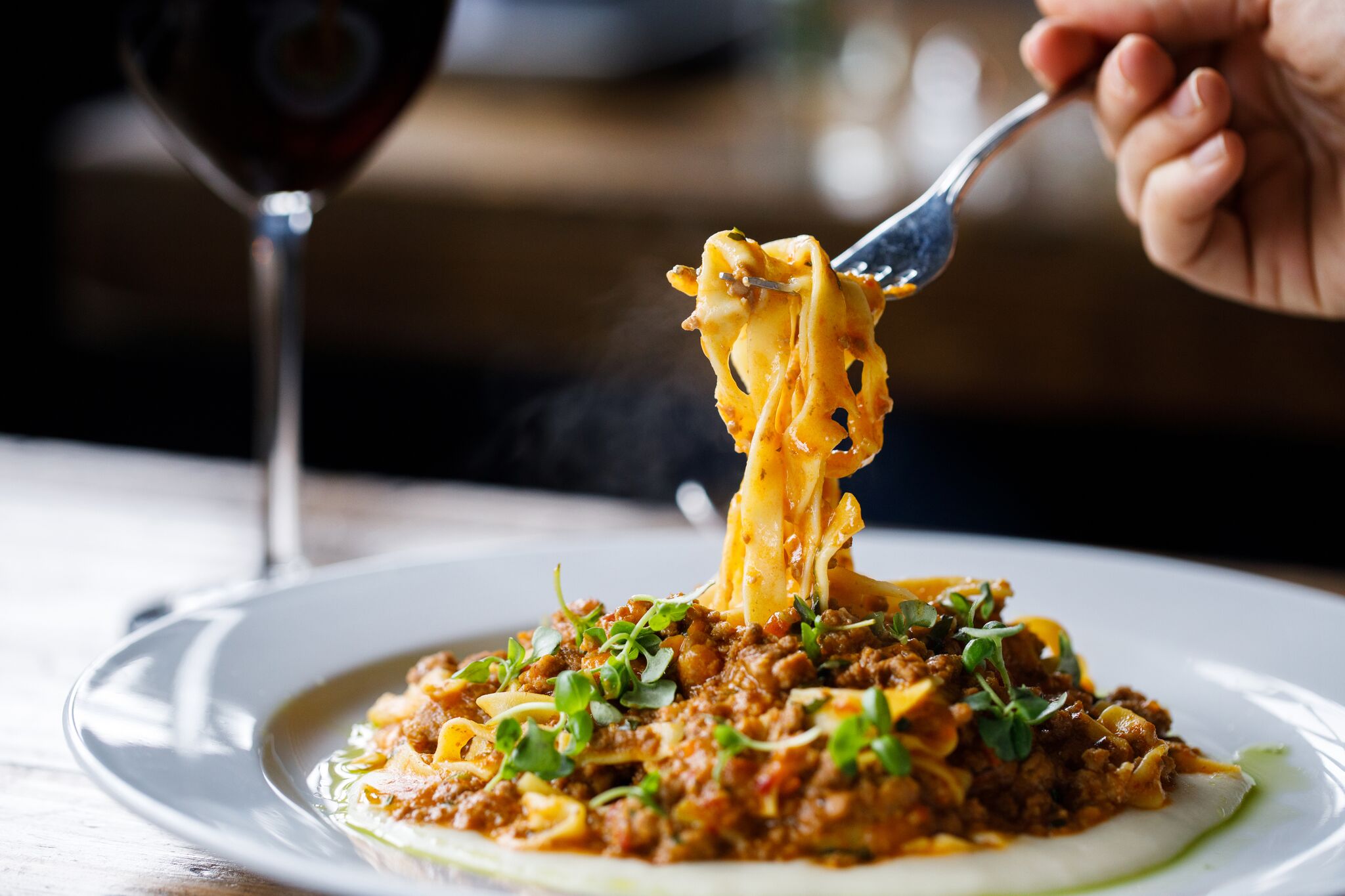 Gemelli pasta, braised short rib, crimini mushrooms, wilted arugula, crushed croutons, parmesan – horseradish sauce.